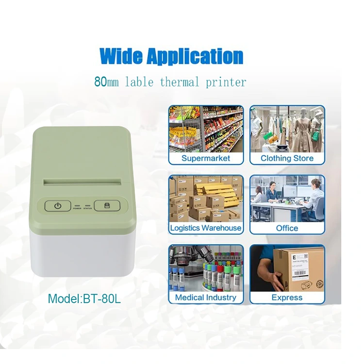Koncept oblikovanja našega barvnega termičnega tiskalnika nalepk je omogočiti strankam, da ga uporabljajo v tovarniških skladiščnih sistemih, majhnih maloprodajnih trgovinah, ki potrebujejo tiskanje majhnih nalepk, za tiskanje majhnih nalepk, črtnih kod, odpremnih oznak, nalepk itd. Model 80L lahko podpira tiskanje v širinah od 20 do 80 mm, zaradi česar je primeren za različne stranke z različnimi potrebami. Zasnovan je tako, da je kompaktne velikosti, zaradi česar je priročen za prenašanje in namestitev.
